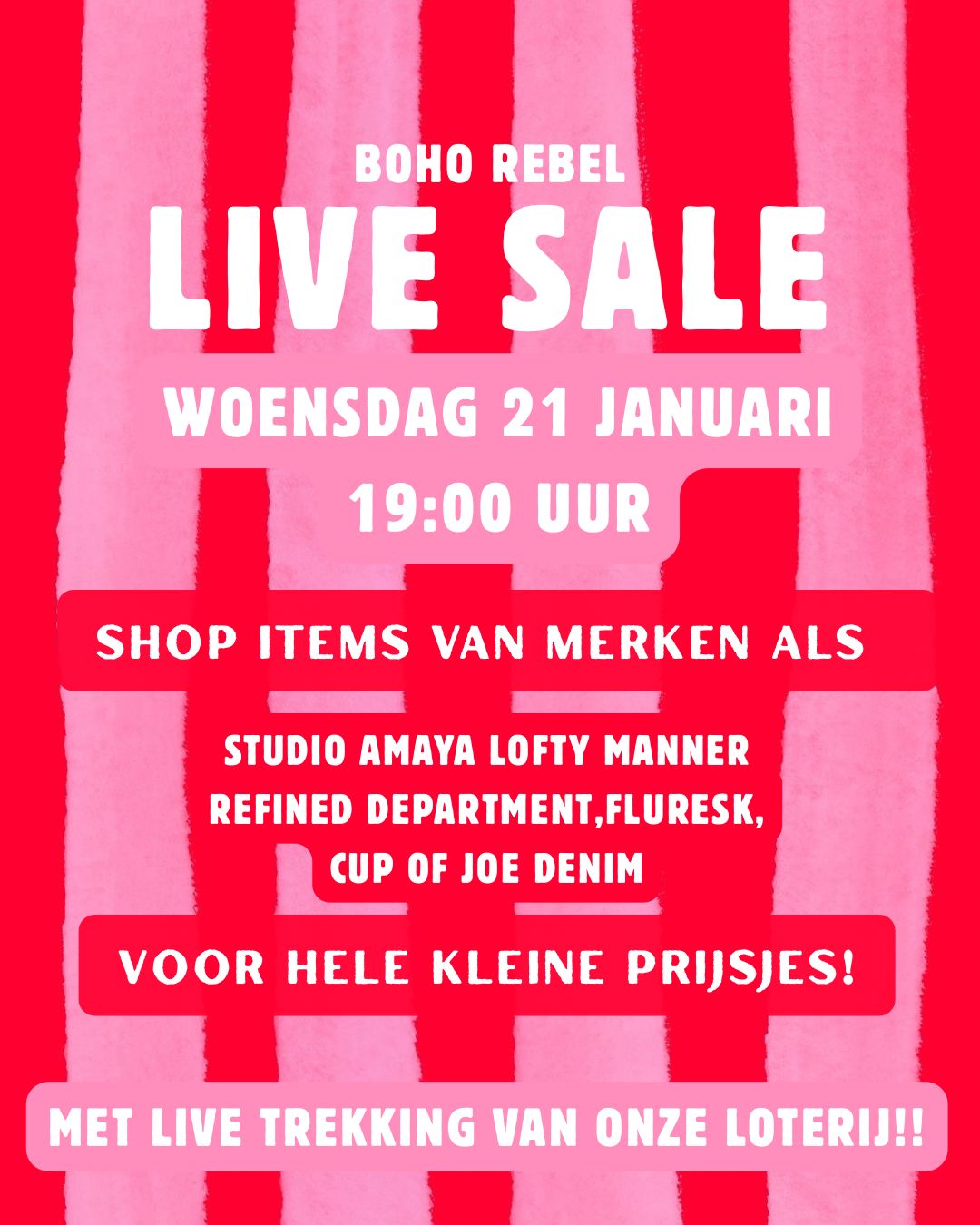 Kijk woensdag 21 januari mee naar onze live sale! Items van merken als Studio Amaya, Lofty Manner, Refined Department, Cup Of Joe Denim, Fluresk en meer! Voor hele kleine prijsjes. Reserveer jou items via de insta live sale! ! 19:00 uur.