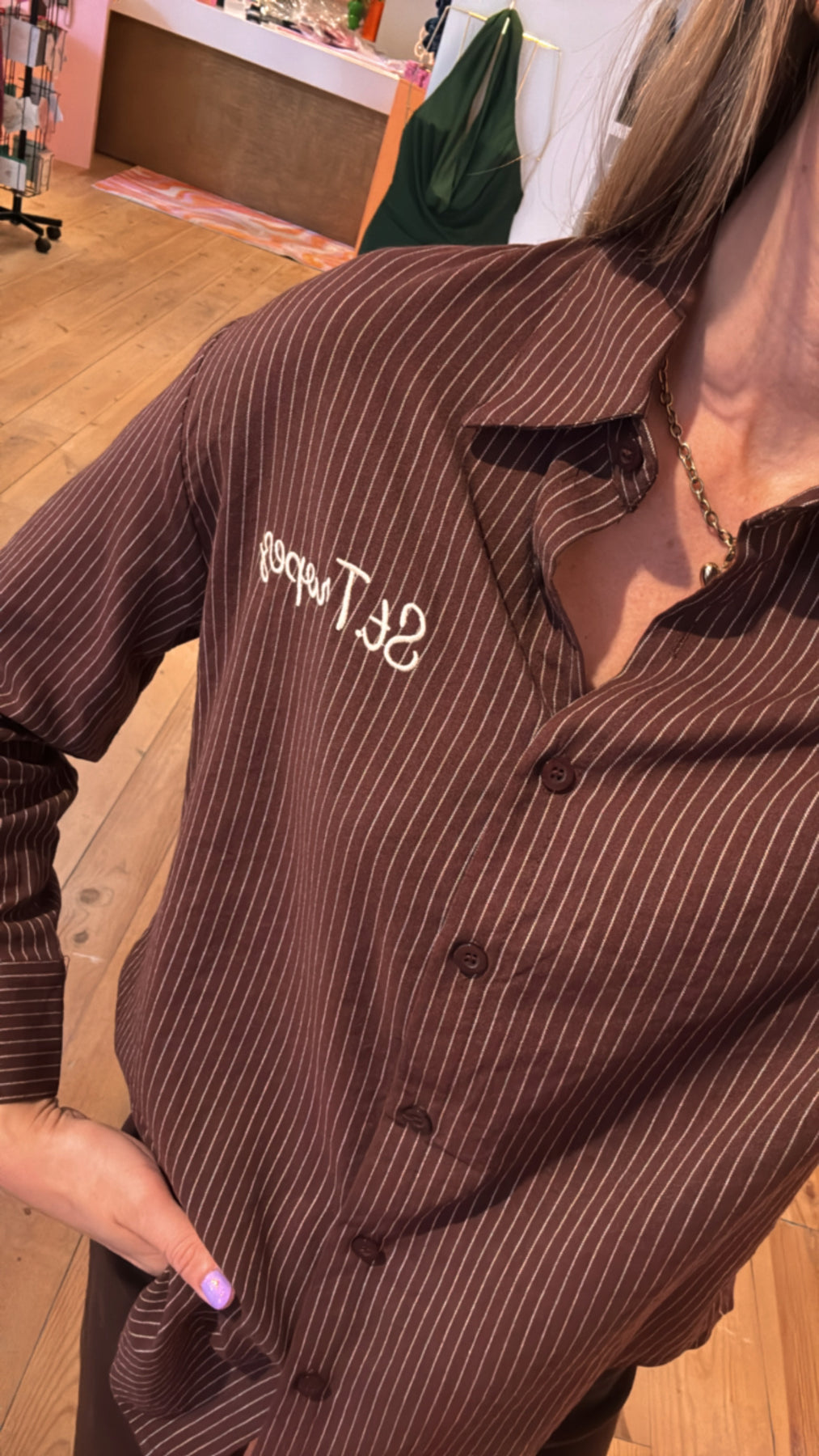 Bruine blouse met een witte streep. St tropez op de voor en achterkant