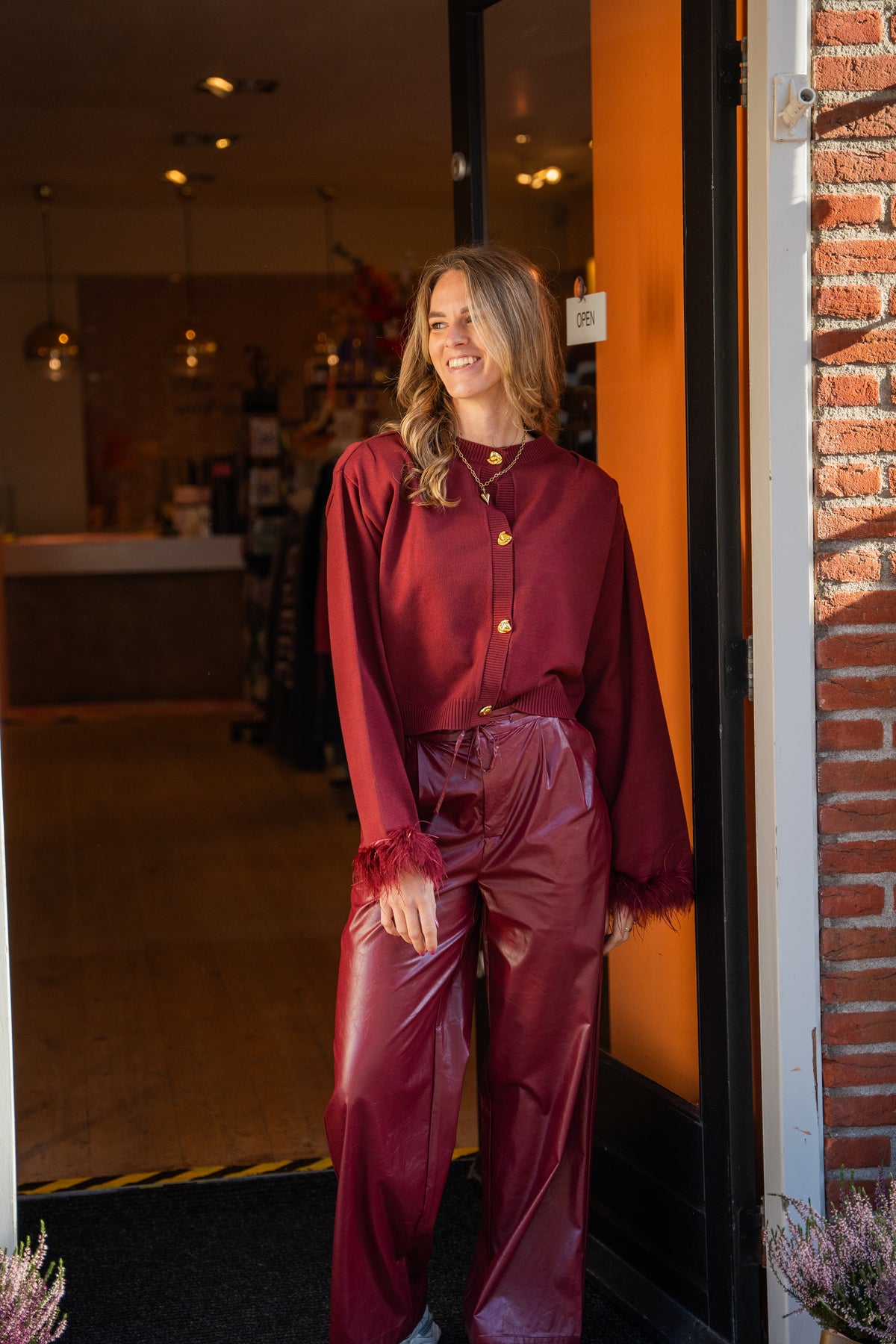 Bordeaux rood vestje van het merk Refined Department. Leuk met veren details op de mouw. Het vest is leuk te combineren met de Bibi Pants. Of uiteraard op een denim