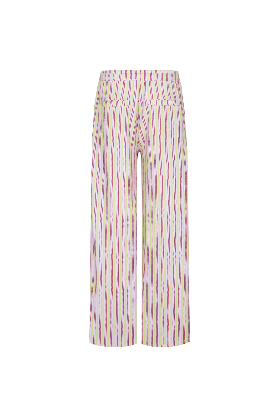 Broek met elastiekenband van het merk Fluresk. In het Pistache paars gestreept. De broek is goed te combineren met het Yanelis t-shirt.