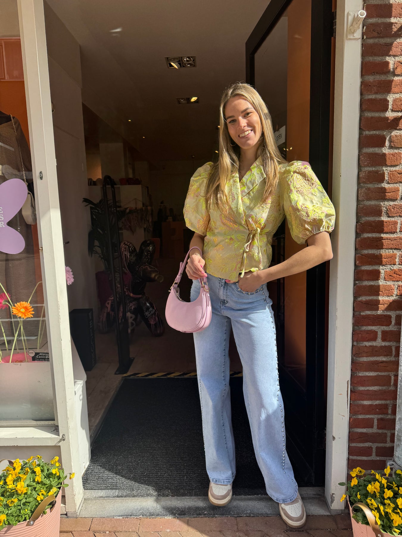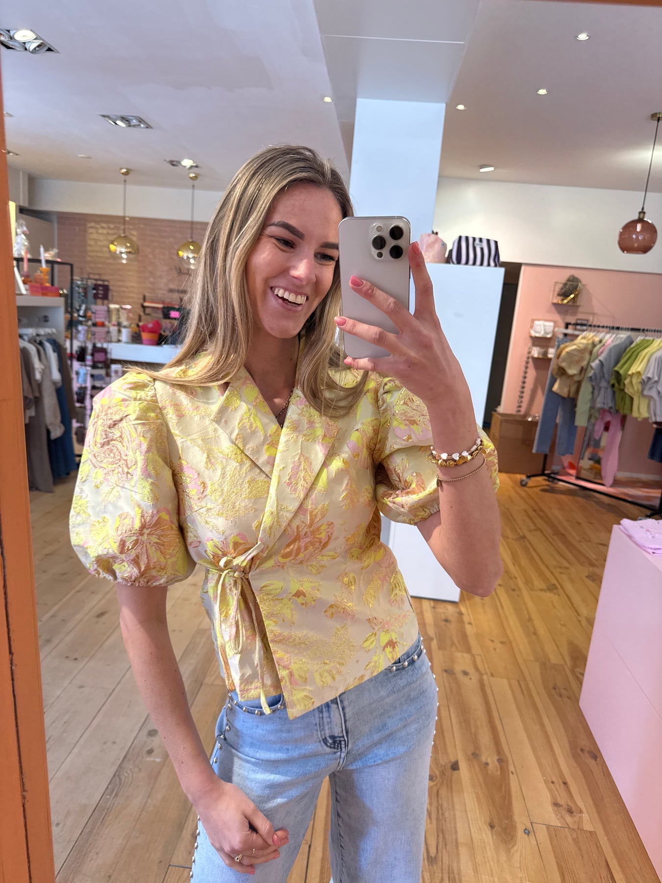Gezellige blazer met strik in een mooie stof. Met zachte kleurtjes. Pofmouwtje