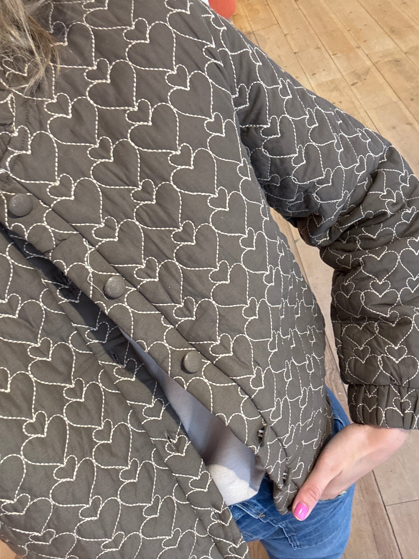 Leuk tussenjasje met hartjes patroon. In de kleur khaki/taupe met beige hartjes. De bomber is ook verkrijgbaar in het bordeaux en paars.