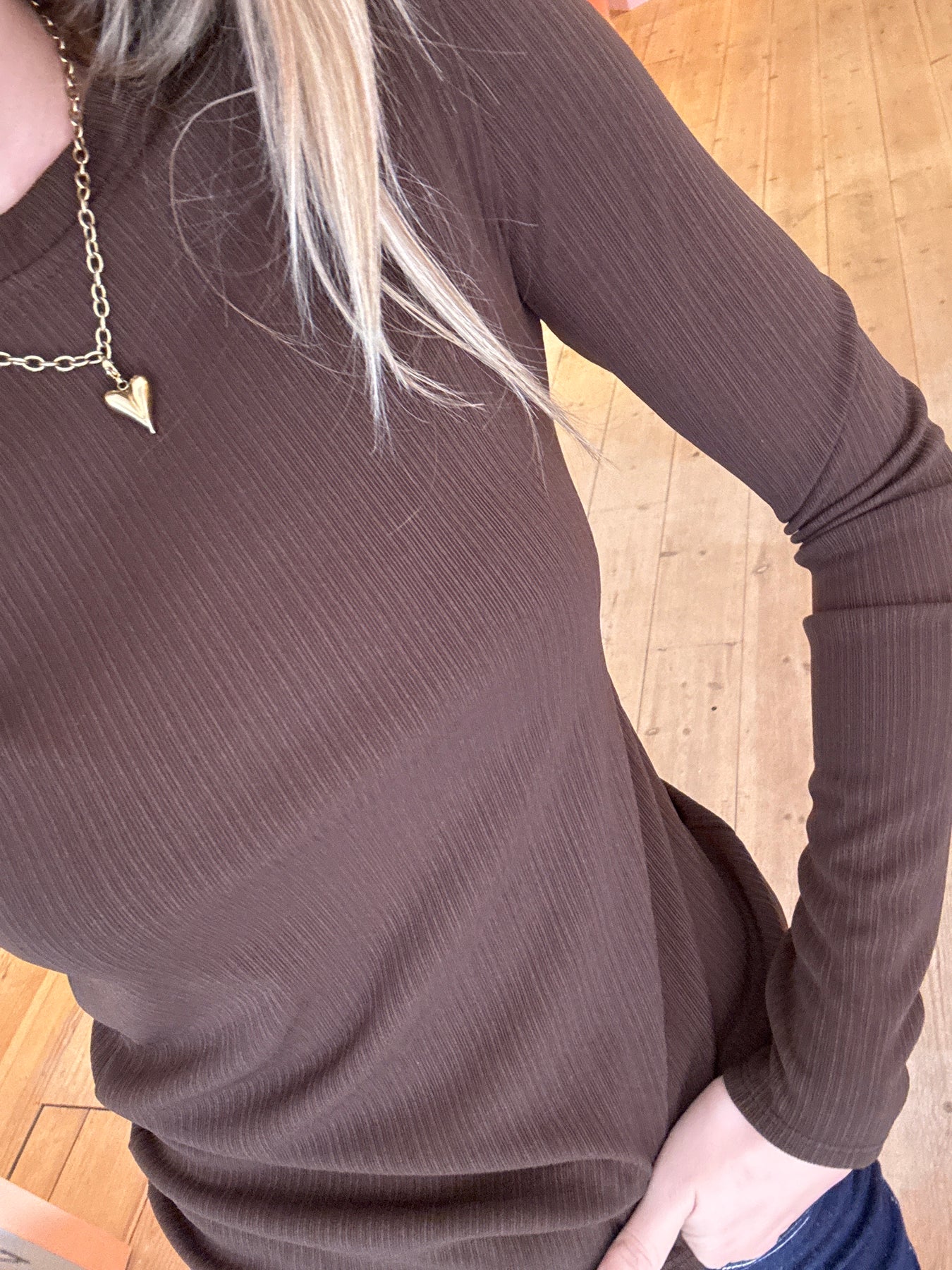 Lange mouwen top met stretch. In de kleur bruin, ook verkrijgbaar in army groen. De top heeft een ribbelstof. Perfect voor het najaar, ook goed onder een jasje/blazer te dragen.