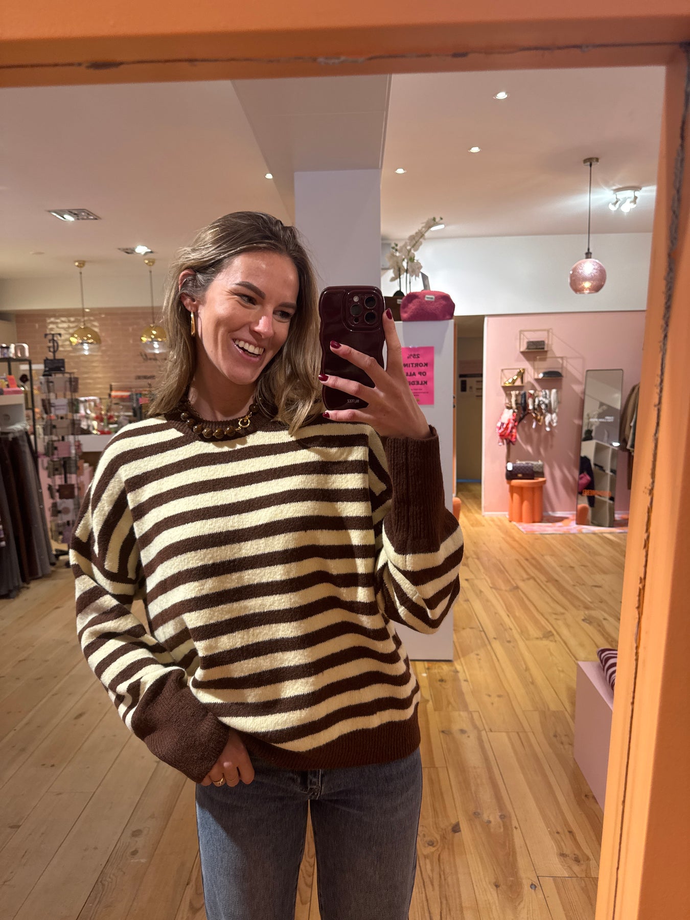 Leuke gestreepte trui. One size. In de kleuren bruin/geel gestreept. Zachte stof. Goed te dragen van xs t/m xl